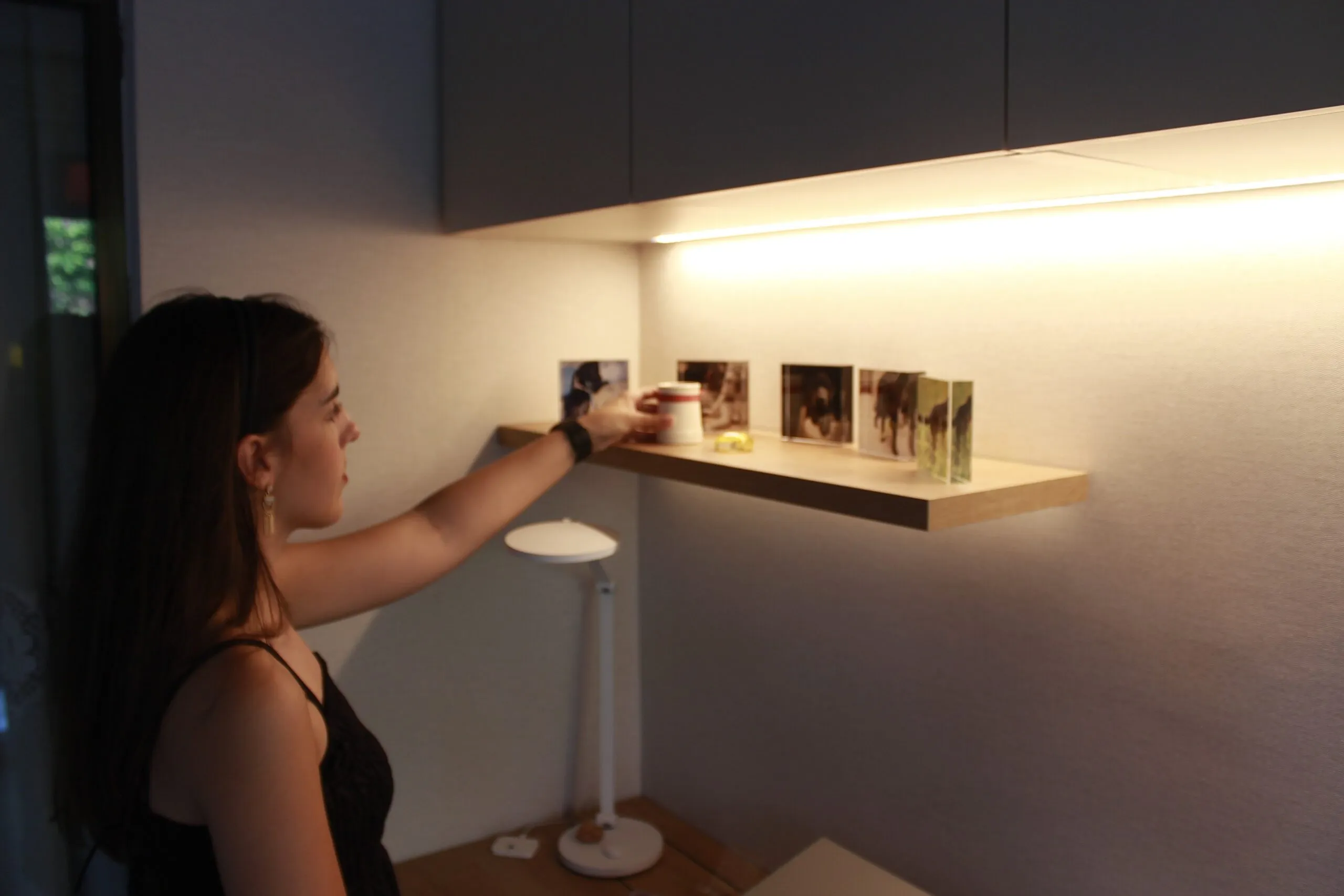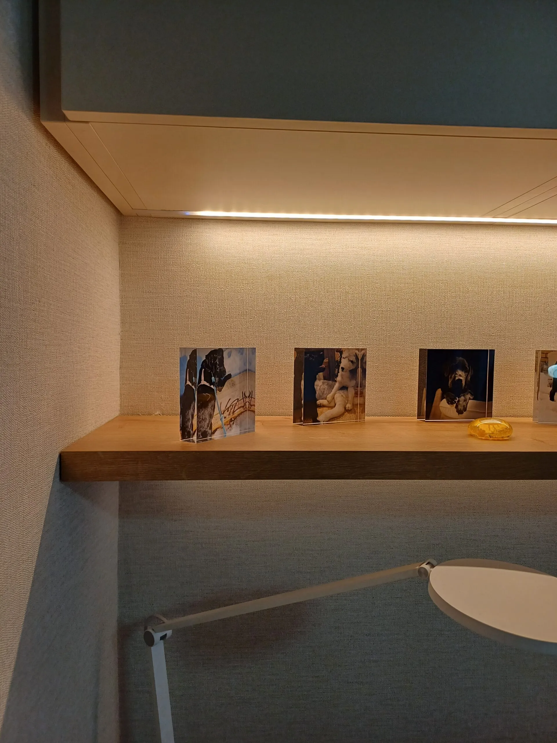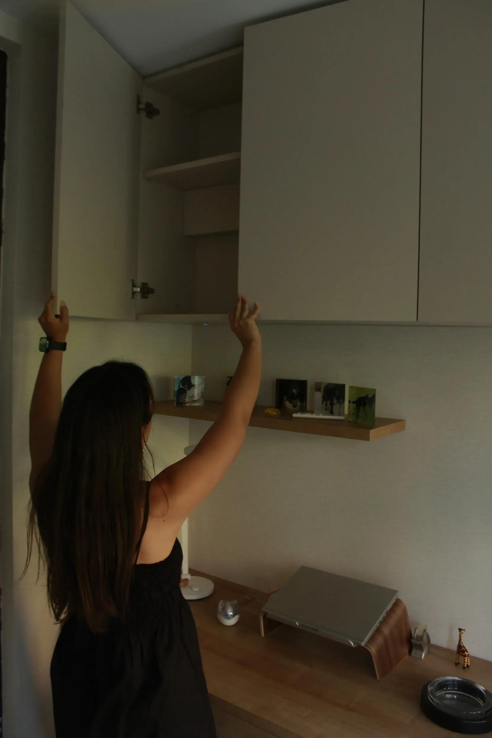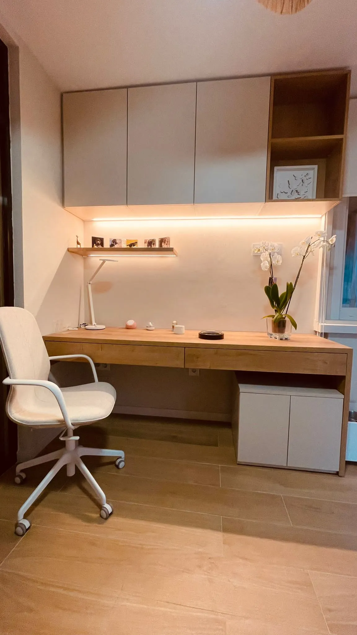 Se diseñó a medida toda la zona de trabajo con un gran escritorio y módulo bajo de puertas donde está ubicada la impresora. Sobre el mismo, creamos módulos altos, uno de ellos abierto para aportar más ligereza visual, conseguido también gracias a las dos baldas con led.