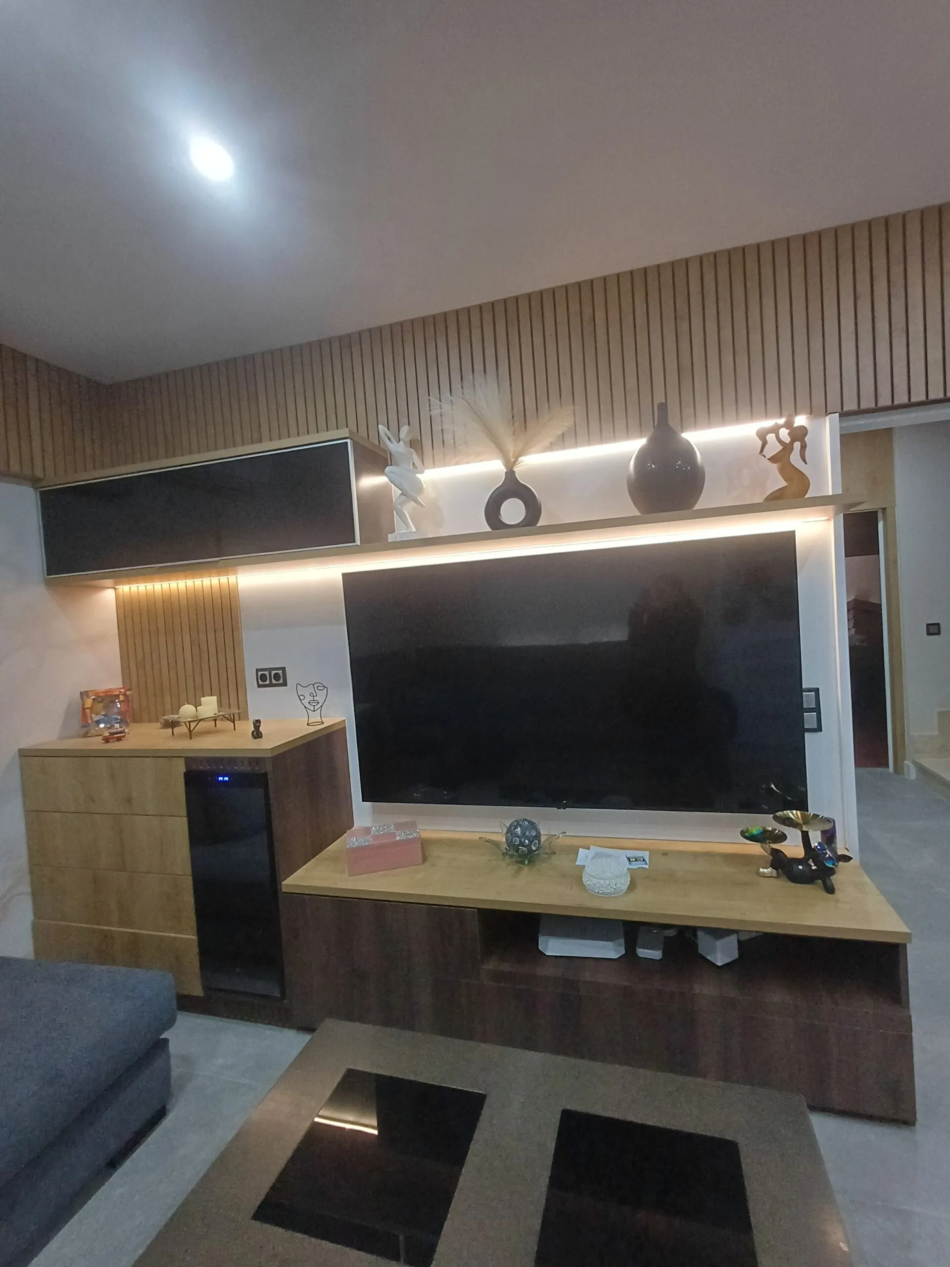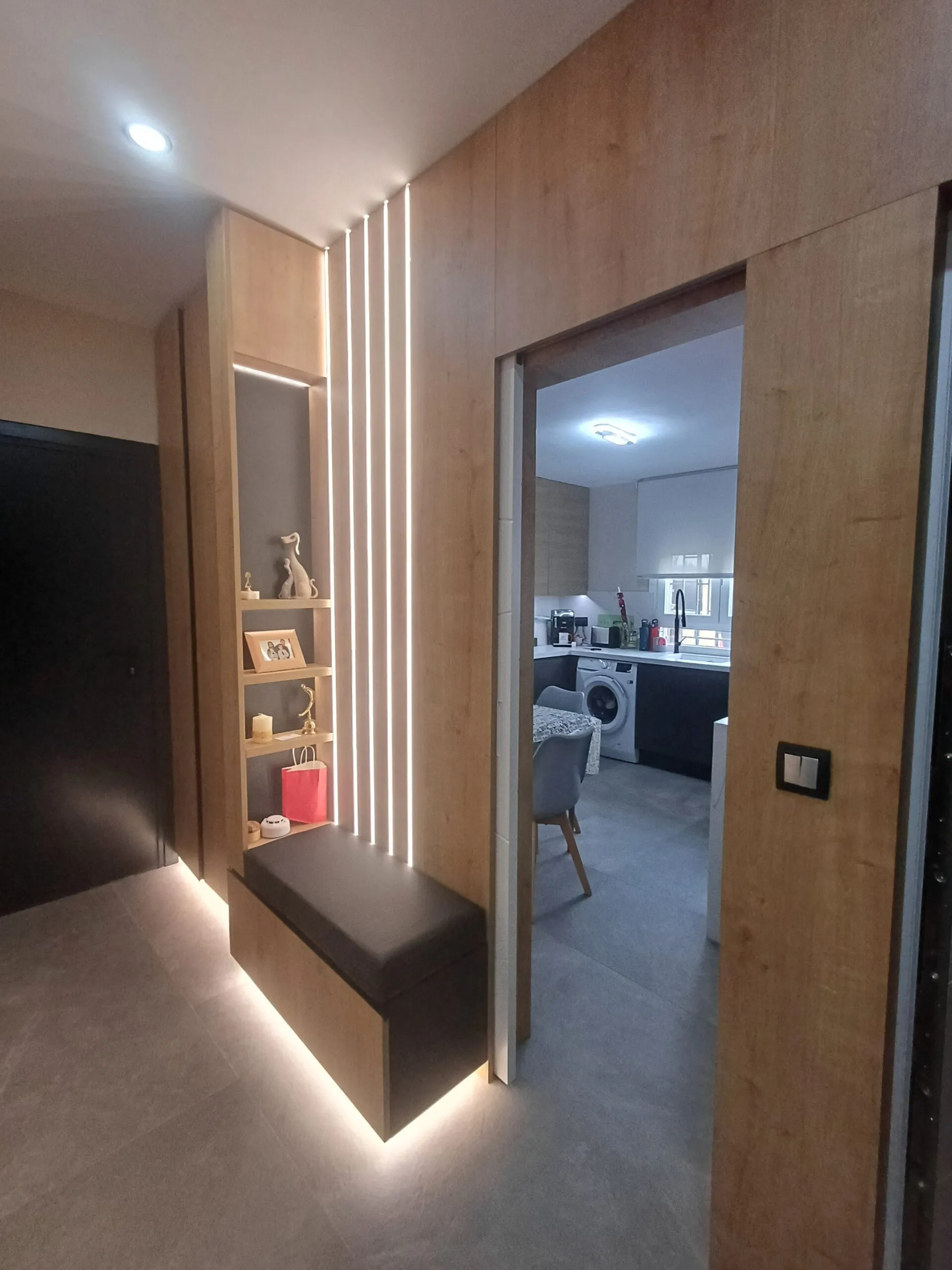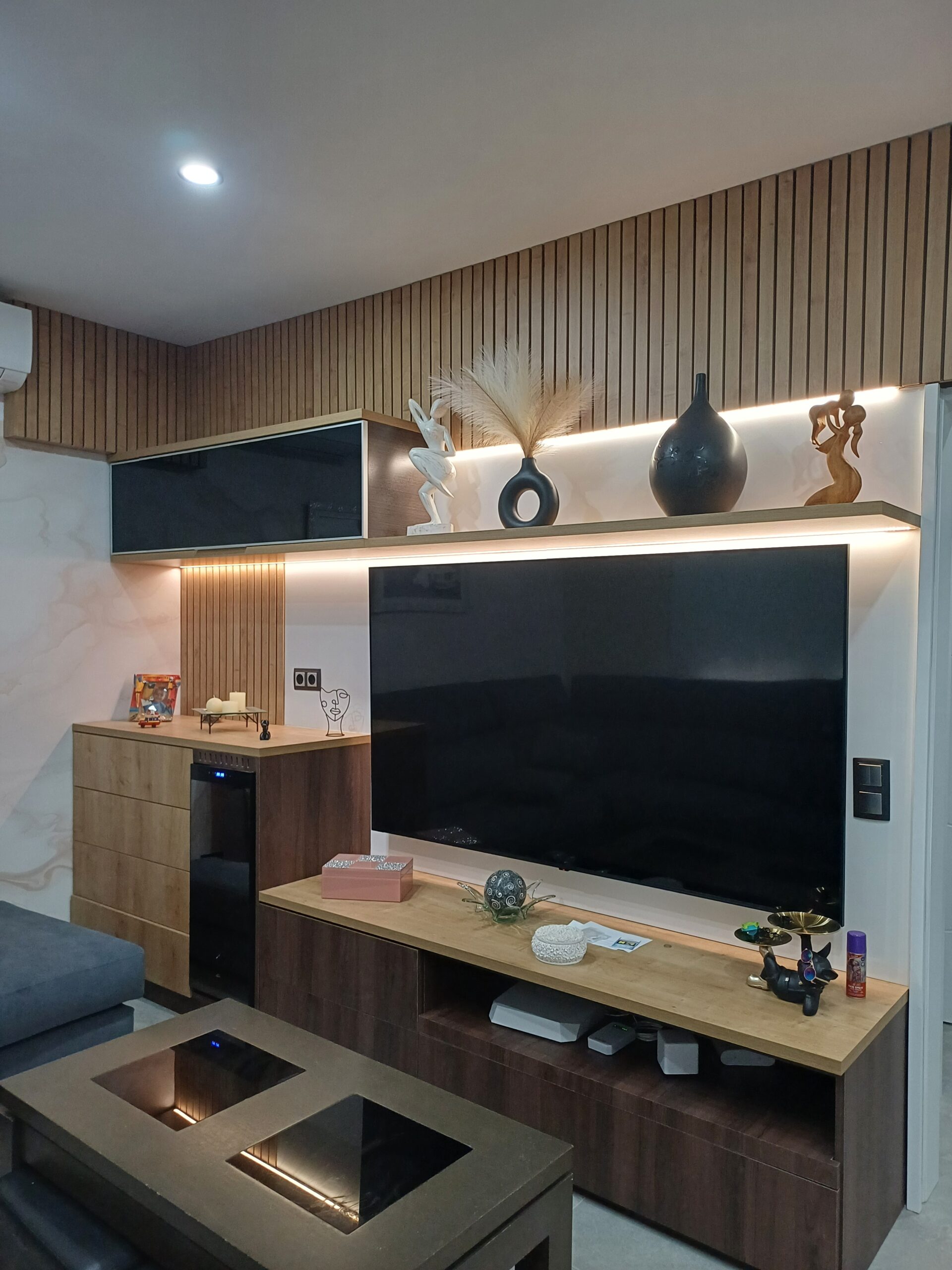 Este proyecto nace de la idea de rediseñar por completo la pared de televisión e incorporar un mueble minibar, además de crear un mueble recibidor con mucho almacenamiento y zona para sentarse.