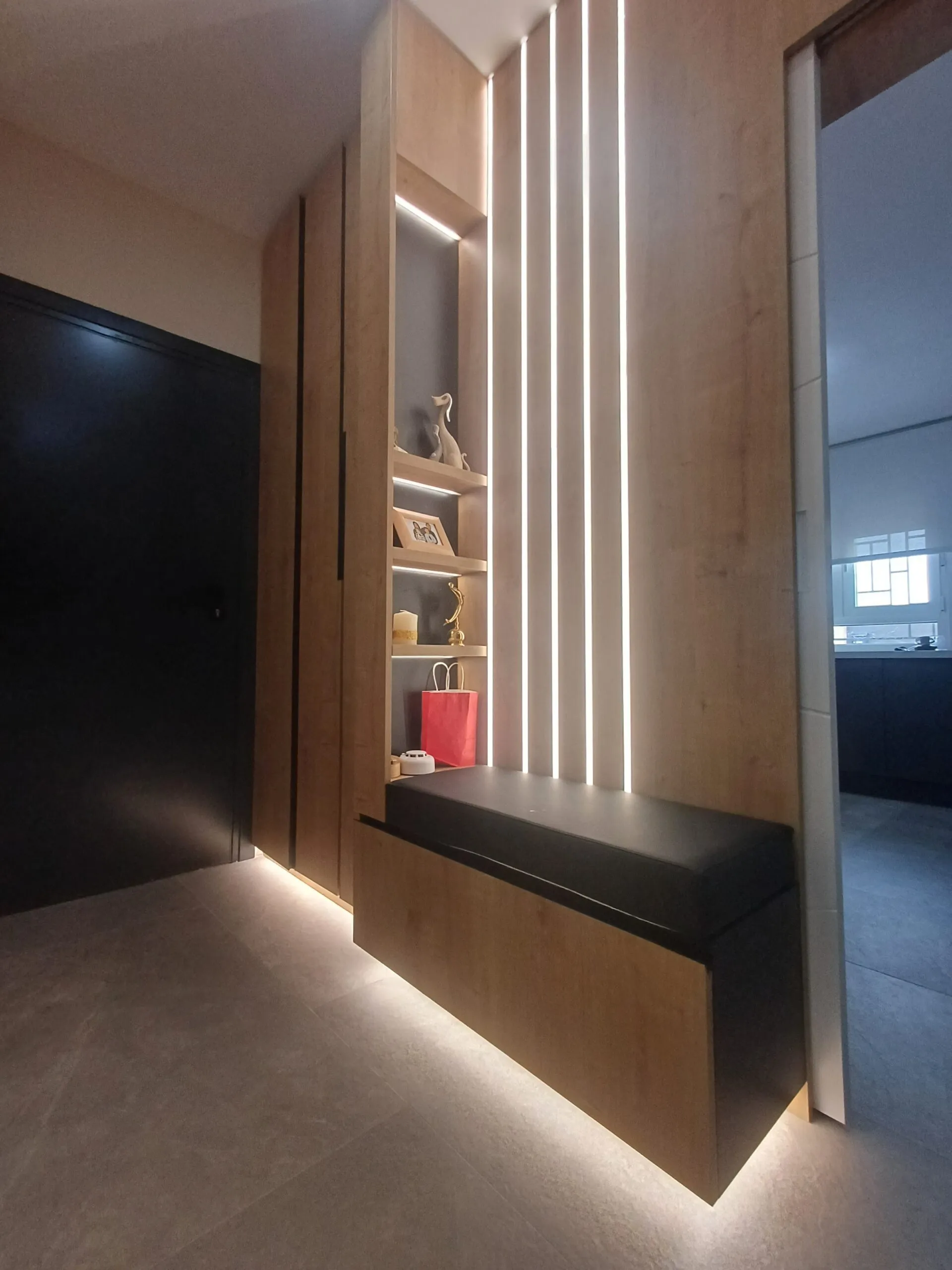 En el recibidor, necesitaban almacenamiento para abrigos y zapatos, además de un banco para sentarse